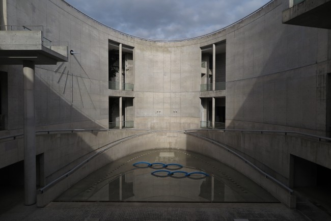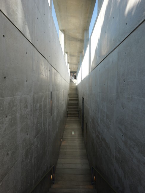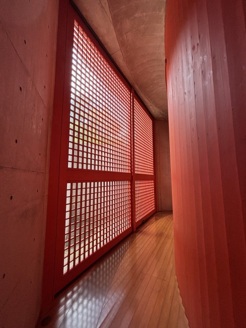 内観 杉板の型枠のコンクリート打ち放しのテクスチャがきれい 下に縄文杉の大株の展示が見える